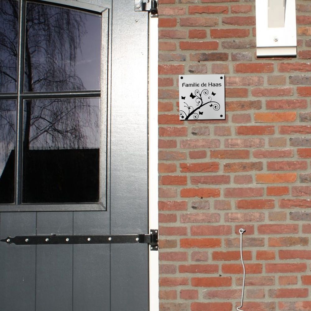 Op dit bordje hebben wij voor u tak ontworpen met daarbij een aantal rondvliegende vlinders. Naast deze standaard opdruk heeft u de mogelijkheid hier zelf nog tekst aan toe te voegen. Denk bijvoorbeeld aan persoonsnamen of een huisnummer.