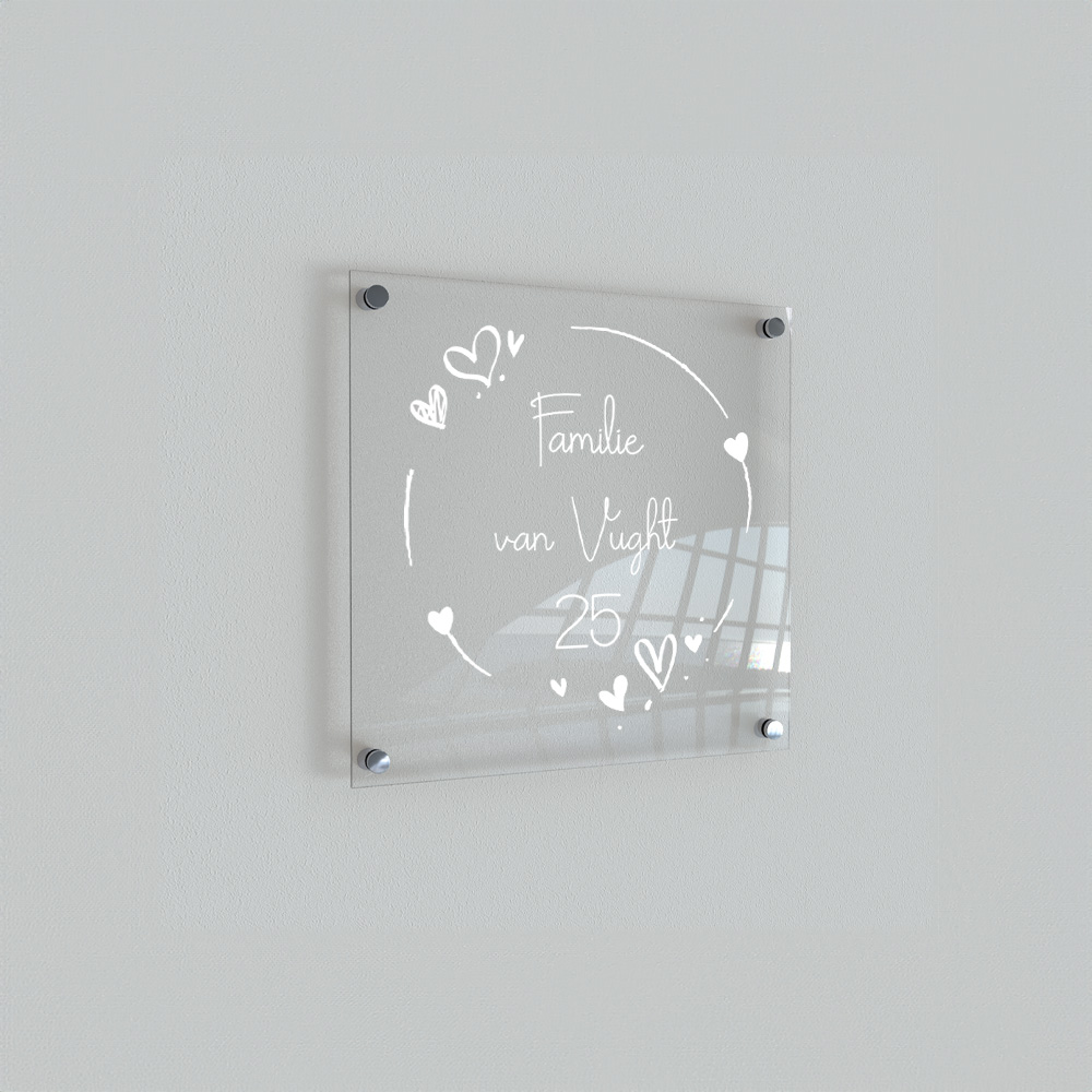 Naambord vervaardigd van een glasheldere plaat. Hierdoor bent u verzekerd van een zeer onderhoudsvriendelijk product. De RVS afstandhouders zorgen ervoor dat het naambordje 15 mm. vrij van de muur zal komen te hangen. Omdat de bedrukking wordt aangebracht op de (achterzijde van het) acrylglas door middel van vinyl stickers, ontstaat er een fraaie dieptewerking en krijgt het naambord een luxe uitstraling. Alle benodigde bevestigingsmaterialen (muurpluggen, afstandshouders en geslepen RVS sierdopjes) worden meegeleverd.